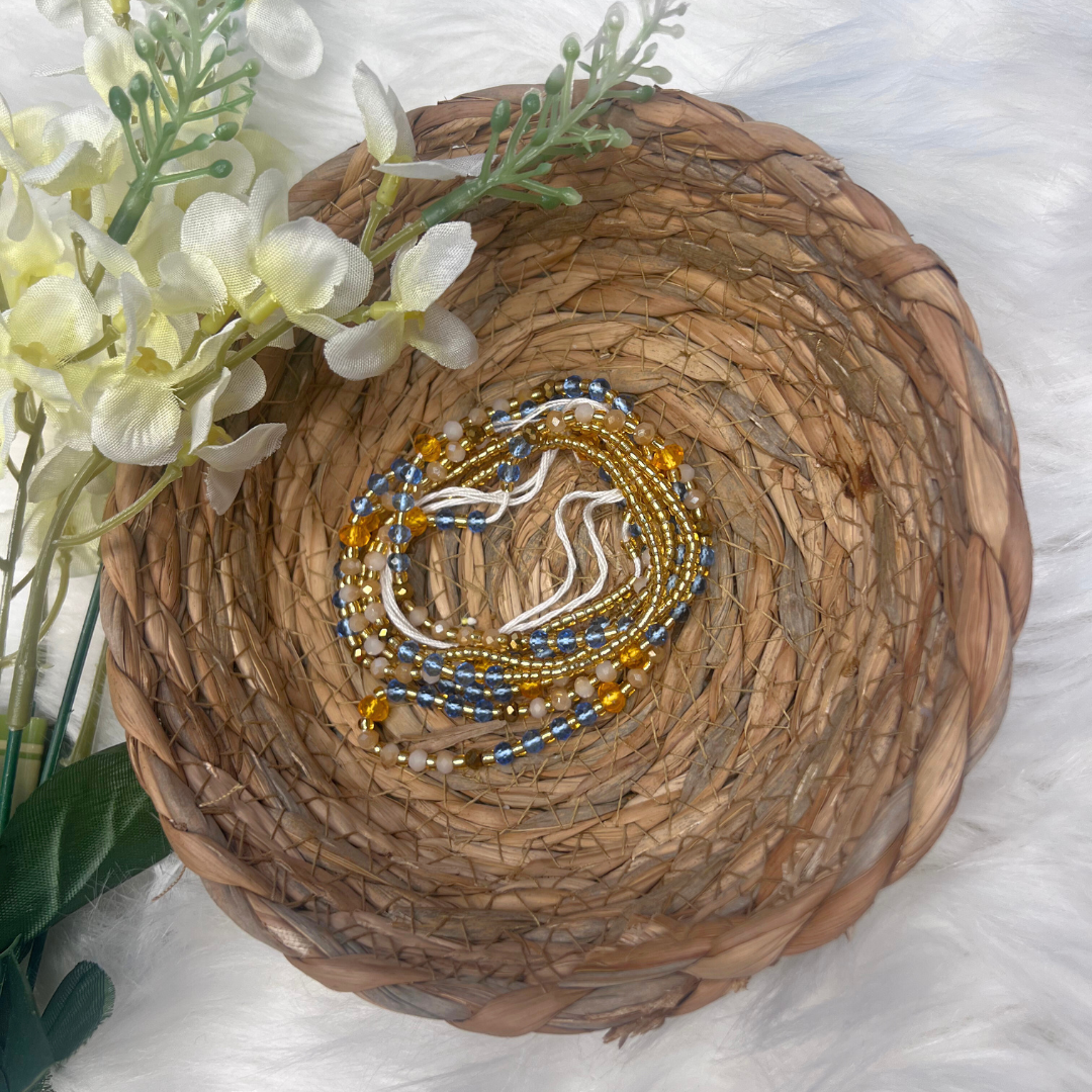 - Golden Sunrise: Radiate positivity with golden and soft blue beads.